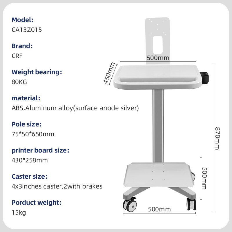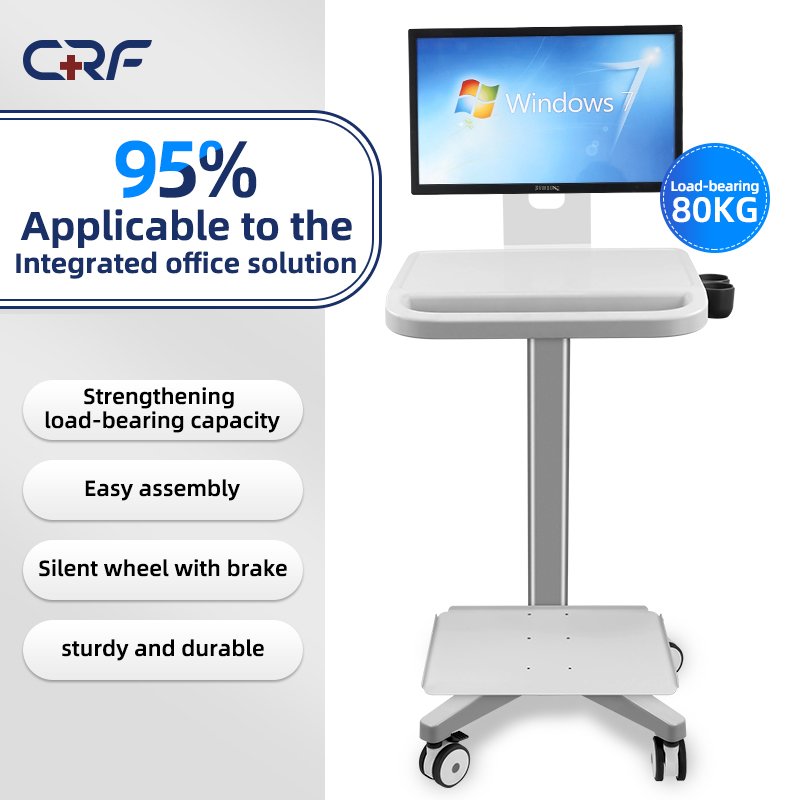 The CRF Integrated Office & Medical Computer Cart (Model CA13Z015) is a versatile, multi-functional workstation designed to streamline workflows in hybrid healthcare and office environments. Combining aerospace-grade aluminum alloy with durable ABS components, this cart offers robust performance for transporting computers, printers, medical devices, and office supplies while ensuring quiet, secure mobility.